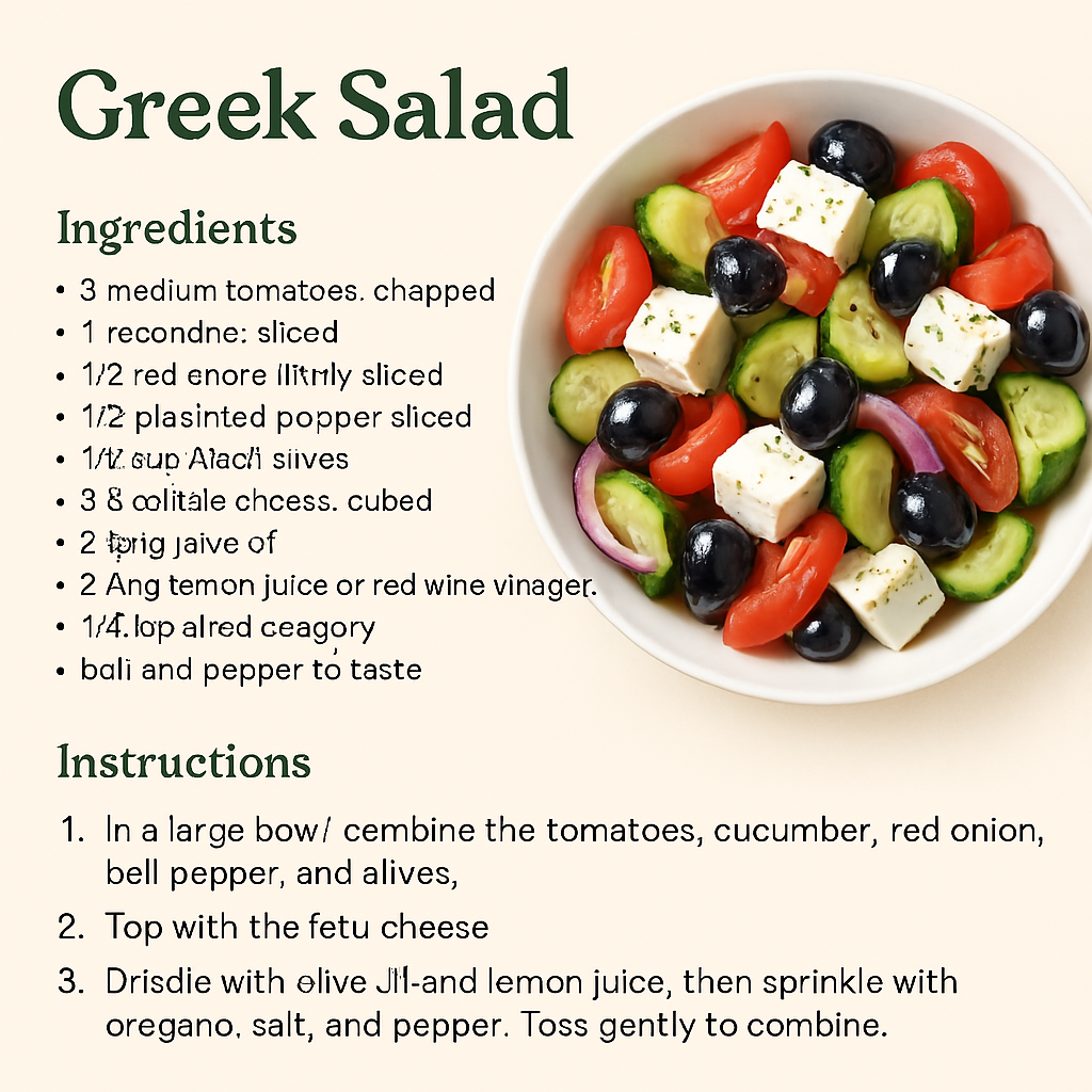 그리스의 따사로운 햇살과 청량한 바다를 닮은 음식이 있다면, 바로 ‘그릭 샐러드(Greek Salad)’일 겁니다. 원래 이름은 ‘호리아티키 샐러드(Choriatiki Salad)’로, 직역하면 “시골 스타일 샐러드”라는 의미를 가지고 있어요. 소박하지만 건강하고 풍성한 맛을 담고 있어 세계적으로도 사랑받는 샐러드 중 하나입니다.
